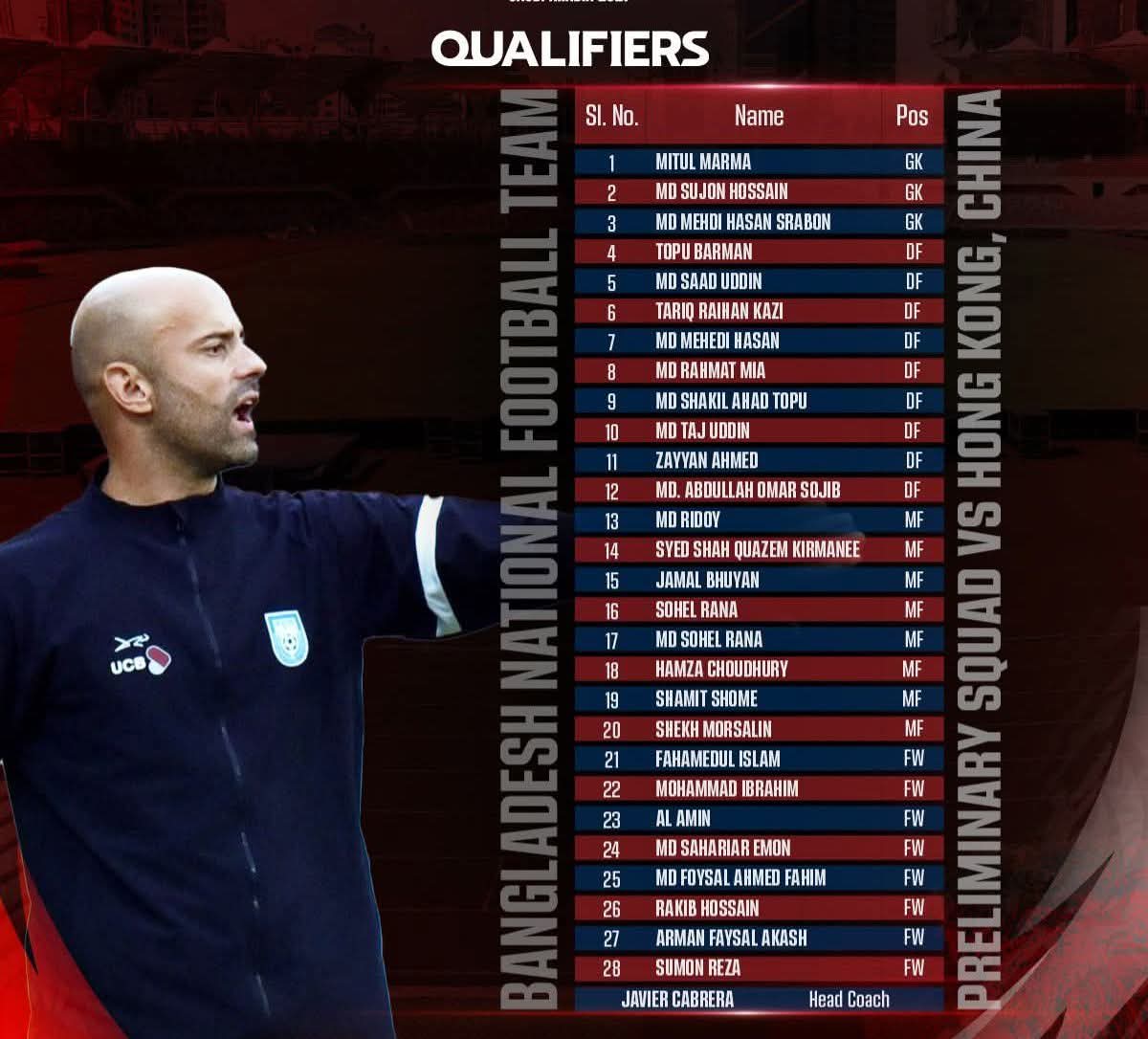 হংকংয়ের বিপক্ষে এশিয়ান কাপ ম্যাচের জন্য ২৮ সদস্যের দল ঘোষণা